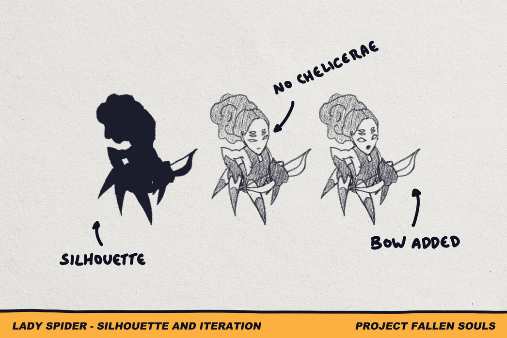 The character uses its webs to shoot the enemy and is a minion of the great Soul King. By exploring different body variations for the concept and mimicing actions of real spiders, I was able to develop a character who can be easily identified and can reveal fun animations.